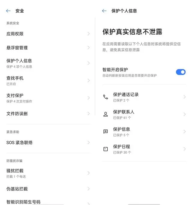 现如今,大家都已习惯下载各种 APP 去解决生活中碰到的问题。然而有不少 APP 在安装时就诱导用户授予各类权限,不知不觉就把联系人、短信等敏感权限"拱手让人",甚至还有部分 APP 不授予这些权限就无法运行。对此,ColorOS 7.2 的「安全」-「保护个人信息」里,支持对通话记录、联系人、信息和日程等的保护。开启后,一旦 APP 要求授予对应权限,系统会返回「空信息」,有效防范个人隐私泄露,同时也使得 APP 可以正常运行,可谓一举两得。