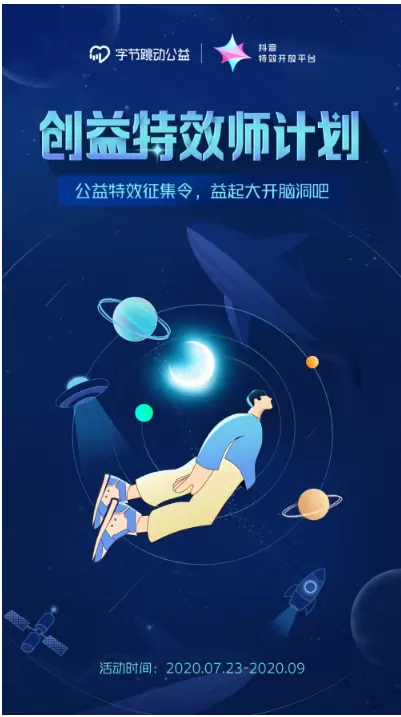 7月23日,字节跳动公益联合抖音特效开放平台发起“创益特效师计划”。该计划针对不同的公益项目,面向抖音道具特效师,长期征集公益主题道具,以降低用户参与公益短视频创作的门槛,激发更多公益UGC内容创作。