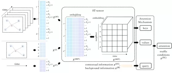 路线耗时预估任务旨在为给定的路线和出发时间估算出对应的通行时间。路线耗时预估任务在智能交通系统(例如导航、路线规划、网约叫车服务等)有着至关重要的作用。该任务面临诸多挑战,尤其是路况预测和道路链接信息。首先,路况预测的准确率和路段的历史路况强相关。现有的工作主要使用时空图神经网络改善路况预测的准确率。然而,这些工作将时间信息和空间信息独立对待,很少考虑时间和空间的关联性。其次,路线的道路链接信息(例如是否拐弯等)也会对用户的驾驶速度带来较大影响。之前的工作主要使用序列化结构去建模路线的道路链接信息。然而,序列化建模方式很难适用于大规模真实服务。
