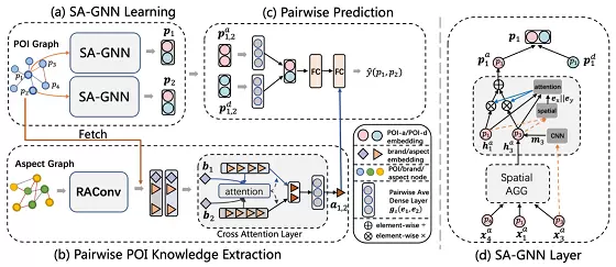 论文中,百度首先使用POI评论和地图搜索数据构建了一个异构的POI信息网络(HPIN)。同时,百度提出一种基于图神经网络的深度学习框架DeepR。该框架由空间自适应图神经网络(SA-GNN)和POI知识抽取模型(PKE)两个部分组成。SA-GNN具有面向空间的聚合操作和基于空间依赖的注意力机制等特殊结构,可以有效结合POI的空间信息和位置分布对POI的表征进行学习。同时,PKE利用关系图卷积计算和交叉注意力网络提取HPIN中的有关POI的知识特征。在两个真实数据集上的实验结果证明了DeepR的有效性。