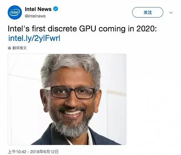 昨天,英特尔发推正式确认,其首款独立GPU最早将于2020年问世,并附上了一张英特尔首席架构师Raja Koduri的照片。