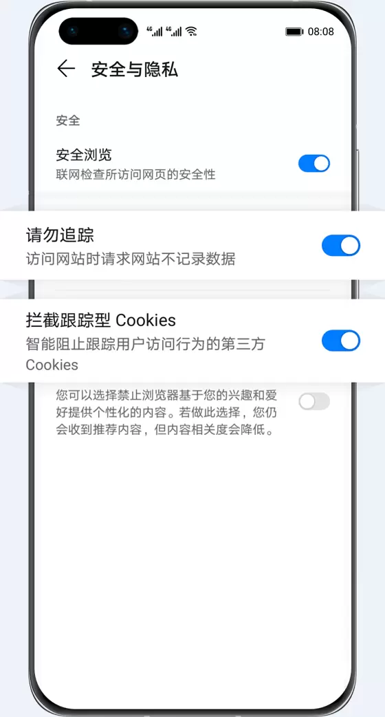 华为浏览器会贴心的提前识别“跟踪型网址”,并自动同步到你的手机。当你访问这些“跟踪型网址”时,浏览器会自动禁止携带跟踪Cookie,从而抗击这种跨网站跟踪行为。这些动作全部在手机中完成,不会影响正常网站的使用。这样一来,你看过什么内容就只有你知道,而不会成为恶意广告的目标。。你可以通过浏览器设置->安全与隐私页面,打开“请勿追踪”和“拦截跟踪型Cookies”开关后,便能享受这种保护啦!
