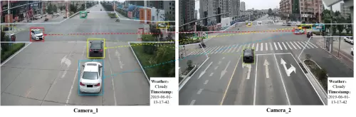 在上述的识别任务当中,EM-VEHICLE数据集主打的是多目标多相机(MTMC)检测追踪任务及视频车辆跨镜识别(ReID)任务。其中,针对多目标多相机(MTMC)检测追踪任务,眼控科技EM-VEHICLE提供的数据与当前已公开的质量最高的数据集CityFlow对标,且相较于CityFlow, EM-VEHICLE的优势在于具有更为复杂和多样的道路场景。例如,在场景多样性方面,CityFlow的数据仅限于白天且光照条件较好的场景,而EM-VEHICLE则涵盖了白天、夜晚、晴天、雨天、多云等多种不同场景;在场景复杂性方面,CityFlow以美国道路作为场景,以机动车目标为主,而EM-VEHICLE则是以中国道路为实际场景,路况更为复杂,除了机动车,还有大量行人与非机动车的干扰,识别任务具有更高的挑战性。