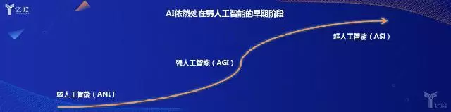 关于讨论的人工智能非常多,我们究竟处在什么阶段?业内把人工智能分为弱人工智能(Artificial Narrow Intelligence/ANI)、强人工智能(Artificial General Intelligence/AGI)、超人工智能(Artificial Super Intelligence/ASI)。我们把时间维度拉长,在2018年这个时间点,毫无疑问我们处在弱人工智能的阶段。如果我们再把弱人工智能分为早、中、晚期;我们很可能还处在早期。也就是说,我们整体处在弱人工智能的早期阶段。