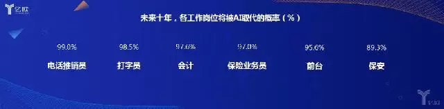 2013年,英国牛津大学的两名教授Carl Benedikt Frey和Michael A. Osborne做了一项研究,主题是“未来哪些工作将被机器人取代”;后来的研究者根据这个研究,把各个岗位将被机器人取代的概率定量算了出来。未来十年,被取代的概率较高的包括:电话推销员99.0%;打字员98.5%;会计97.6%;保险业务员97.0%;前台95.6%;客服91.0%;保安89.3%等。