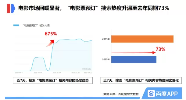 电影院复工通知发出后,“电影票”相关内容的搜索量迅速攀升至近半年内的峰值,此外近七天,百度 “电影票预订”相关内容的搜索热度环比上涨675%,恢复至去年同期的73%,电影市场显著回暖。