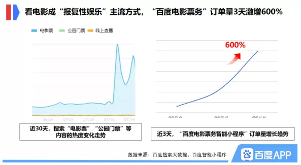 而在电影院回归3天后,百度电影票务类智能小程序日均电影票订单量增长了600%。据了解,在国家电影局发布通知后,百度第一时间联合猫眼电影、爱奇艺票务、淘票票三家综合票务平台进行各个产品入口的恢复与上线。值得一提的是,“电影票”的搜索热度超过了“公园门票”、“线上直播”等其他的娱乐项目,看电影或成当下“报复性娱乐”的主流方式。