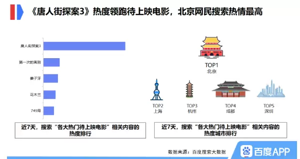 时隔半年重回影院,网友们期待什么电影?在待上映的各大热门电影中,《唐人街探案3》、《第一次的离别》、《姜子牙》、《花木兰》、《749局》成为民众搜索热度最高的五部电影。刚刚下调应急响应等级的北京,成为最关注各大待上映热门电影的城市。