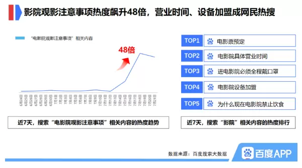 压抑近半年的观影热情终于拥有机会释放,通知发出后,网友们选择第一时间搜索观影相关信息。百度搜索大数据显示,“电影票预定”、“电影院具体营业时间”、“进电影院必须全程戴口罩”、“电影院设备加盟”、“为什么现在电影院禁止饮食”等成为大众热搜话题。与此同时,影院观影注意事项搜索热度飙升48倍,这也从侧面反映出民众的观影热情高涨。