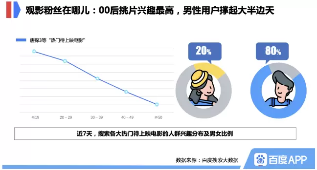 百度搜索大数据显示,在搜索各大热门待上映电影的人群中,00后的搜索兴趣最高,忙“挑片”,而男性用户搜索占比达80%,比女性更期待重启影院观影生活。
