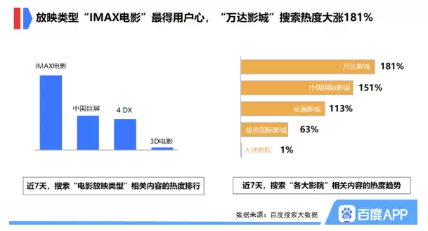 针对“去哪家电影院?”、“看什么类型的影片”。百度搜索大数据显示,近七天“万达影城”、“金逸影城”、“中影国际影城”等覆盖范围较高的影院搜索热度显著上涨,其中“万达电影”的热度涨幅要远高于其他影院;此外,“IMAX电影”、“中国巨幕”、“4DX”、“3D电影”等电影放映类型的搜索热度也出现不同幅度的上涨,其中“IMAX电影”相关内容的涨幅明显高于其他放映类型,电影放映类型或将成为影院排片时的重要参考因素。