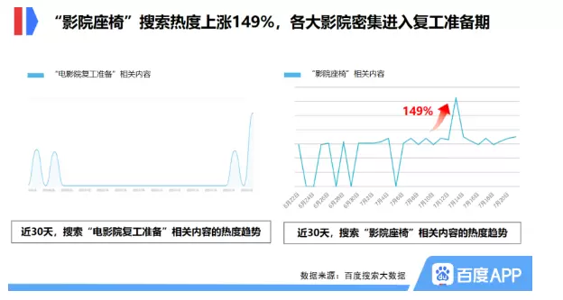 伴随着影院的逐步恢复,各地院线也在积极为复工复产做准备,迎接观众回归。百度搜索大数据显示,近30天“电影院复工准备”相关内容的搜索热度环比上涨150%,“影院座椅”相关内容搜索热度环比上涨149%,各大影院密集进入复工准备期。