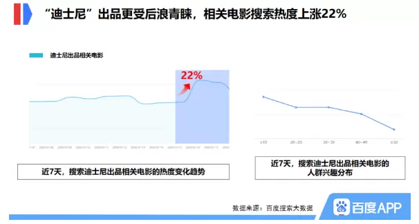 除此之外,迪士尼相关电影作品的搜索热度也有所增长,近七天环比上涨了22%。其中,00后对迪士尼相关作品青睐有佳。