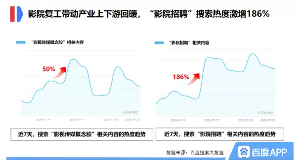 值得关注的是,影院恢复影业通知发出后,影视产业也“回暖”迅猛。百度搜索大数据显示,近七天,“影视传媒概念股”相关内容的搜索热度环比上涨50%、“影院招聘”相关内容的搜索热度环比上涨186%,影院恢复营业,院线正式复工,影视产业信心得到大幅提振。