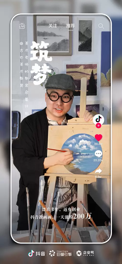 在外漂泊多年感觉“熬不住了” 的贾超,选择在去年12月回老家西安创办“古也美术教育”。他做的第一件事就是注册抖音企业号。仅用了3个多月的时间,贾超就把账号做到了600万粉丝,最多一天涨粉200万。截至今年6月,他通过企业号收了近700名学员,收入36万。现在的贾超,怀着一个朴素的美术梦想,就是让偏远地区的孩子和城里孩子一样学画画。