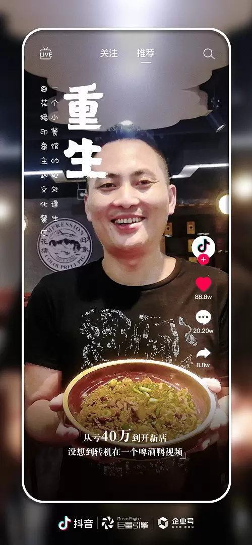 在湖南开“花猪印象主题餐厅”的罗建华,2019年因“猪瘟”亏了40万,今年又遭遇疫情。本想着“放弃算了”的他,无意间因为抖音企业号短视频爆火,带来了大量客源和订单,一个月营业额20万。不仅旧店被盘活了,罗建华还“逆势”开起了新店。