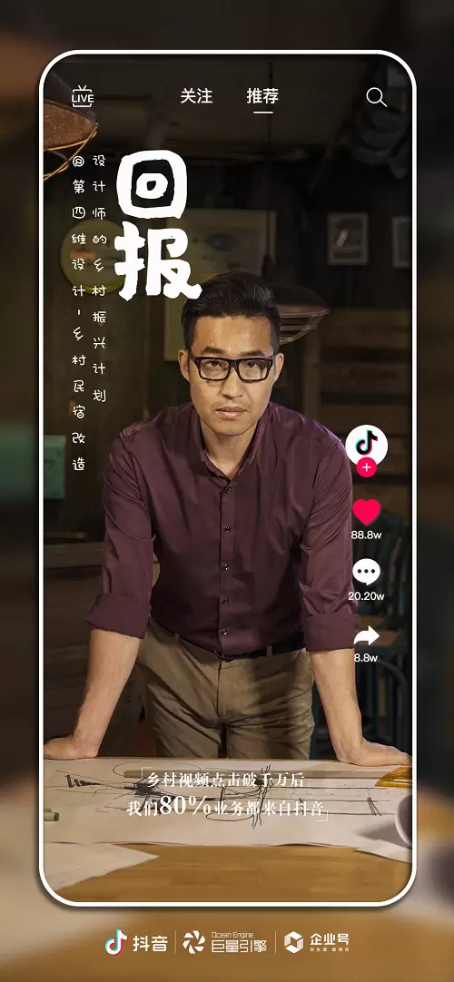 同样在西安,王咏的主业是乡村民宿改造。他期待以乡村民宿为切入口,为乡村振兴出一份力。在他的抖音企业号上,一个乡村老房子的视频观看量冲破了100万。目前,王咏累计为13个村子、约五六百户人家设计改造了住所,他的第四维设计工作室有80%的业务量都来自抖音企业号。