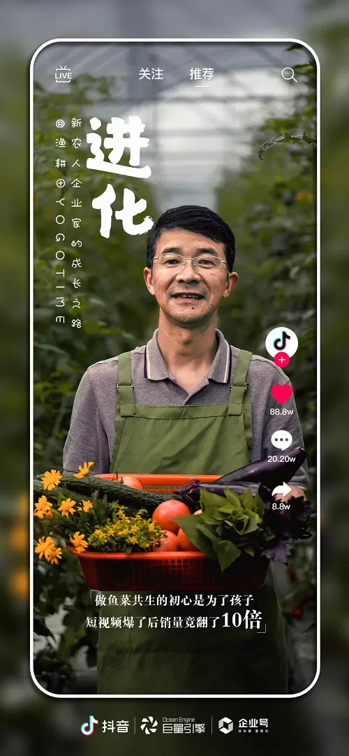 经营“渔耕田”的陈斌,曾就职于某科技公司。因两岁的孩子农药过敏,辞去了百万年薪的工作,自建“鱼菜共生”农场。2018年开始,他借助抖音企业号开设了线上创业培训班,吸引了大量目标客户,销量翻了10倍,如今已是年入千万的企业家。他说,我们一定要在抖音企业号上发力,借势而上。