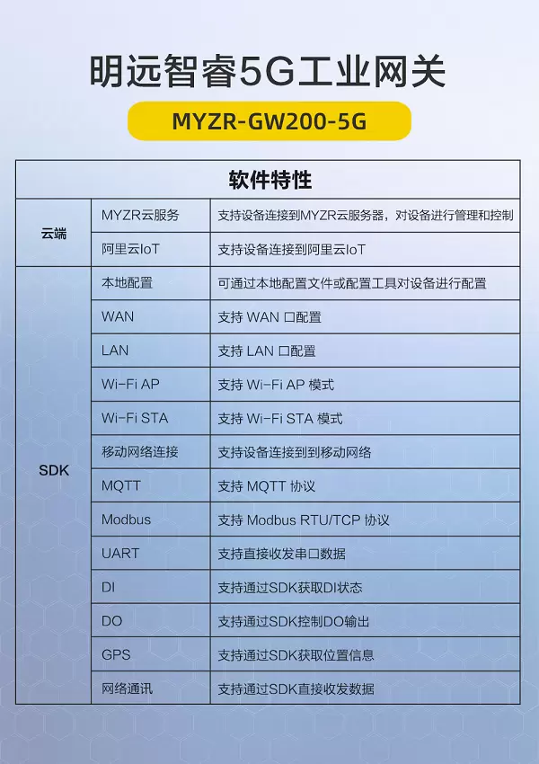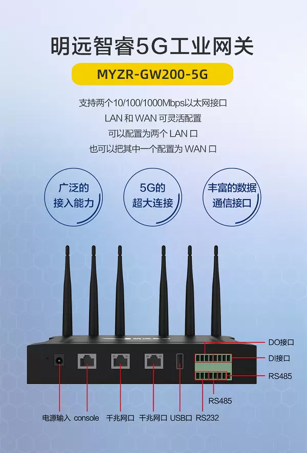 随着5G技术的发展,在高带宽、低延时的特性下,对工业网关的技术要求也日益增高。由明远智睿研发推出的MYZR-GW200-5G网关产品正是一款具备了高性能、高速率、高可靠、低时延的5G全网通工业智能网关产品。