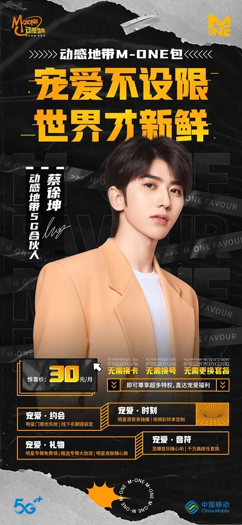 对个性鲜明、兴趣丰富多元的z世代年轻人来说,个性化的娱乐需求与互动体验已成为“刚需”。M-ONE包即是动感地带以“深度定制”的思路,为用户量身打造了一整套个性化、沉浸式的追光权益。全新上线的M-ONE包套餐资费为30元/月,开通后即可一站尽享蔡徐坤数字专辑等音乐作品,免费观看蔡徐坤演出直播,并获得线下演出活动参与机会、专属购票通道;而定期更新的蔡徐坤独家定制视频彩铃、专属皮肤、专属壁纸和专属手机铃声,也传递着明星与粉丝之间的双向陪伴;不定期掉落的祝福语音、独家资讯等彩蛋,则变身追光日常的“小确幸”,给足粉丝耳目一新的惊喜。