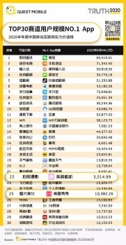 QuestMobileTOP30赛道用户规模NO.1App榜单