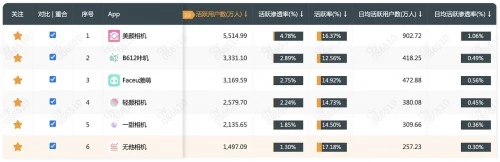 在日活上,美颜相机以902万的月活遥遥领先,是第三名B612咔叽的2.15倍,第二名Faceu激萌的1.9倍。在活跃渗透率上,美颜相机、B612咔叽、Faceu激萌分别为4.78%、2.89%与2.75%位列前三甲。