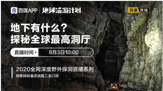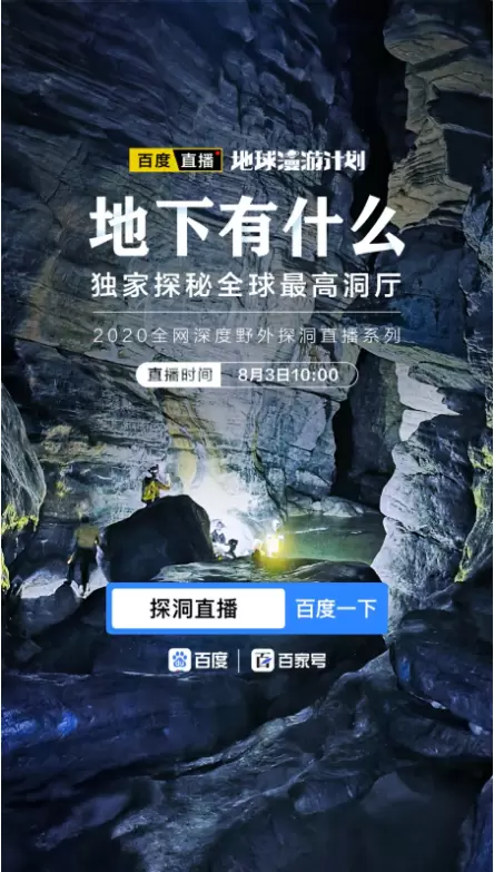 百度App地球漫游计划“水下有什么”系列直播开启了2020年全网深度水下直播的大幕,直播结束后,网友们都在期待地球漫游计划的新节目,现在,它来了它来了,它带着洞穴走来了!百度App地球漫游计划“地下有什么”系列直播将于8月3日开启,聚焦千姿百态的中国地下洞穴,为你带来最真实,最震撼的“地理中国”!