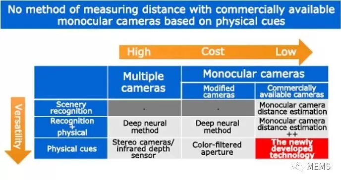 然而,该技术也存在缺点:单目摄像头的测距精度取决于深度学习训练的场景数据,因此对于不同场景中拍摄的图像,测距精度会大大降低。为了消除对这些数据的依赖性,东芝开发了一种分色滤镜(color-filtered