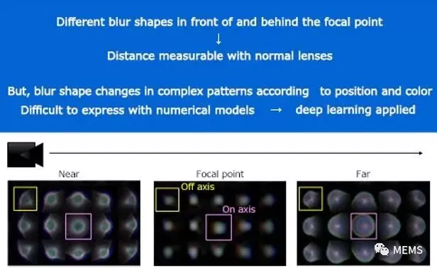 到目前为止,从理论上讲,根据图像模糊的形状进行测距还是非常困难的,因为当物体与焦点等距时,物体无论远近都是一样的(图3)。然而分析结果表明,即使与焦点等距,近距物体和远距物体的模糊形状也存在很大差异(图4)。在此基础上,东芝成功地利用深度神经网络模型训练的深度学习模块对采集到的图像进行模糊数据分析。