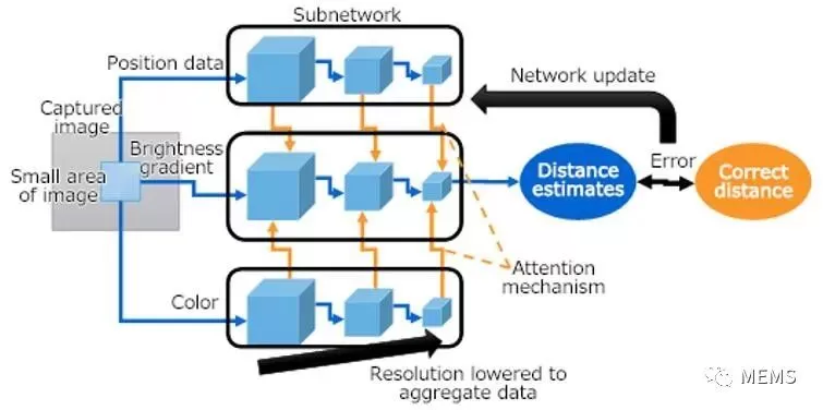 当光通过镜头时,所产生的模糊形状会根据光的波长及其在镜头中的位置而改变。在东芝开发的网络中,位置和颜色数据被分开处理,从而正确感知模糊形状的变化,然后再通过对注意力机制(attention mechanism)进行加权后,用于控制亮度梯度上的焦点,以正确测量距离(图5)。通过学习,对网络进行更新,以减少测量距离和实际距离之间的误差。