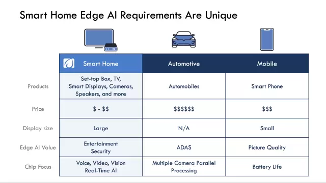 正如我们之前所讨论的,针对智能手机和汽车应用的基于边缘AI的解决方案主要侧重于摄像机视觉应用。但是,在智能家居中,多模式人机交互界面是在连接设备的新时代增强用户体验的关键要素。以机顶盒为例,此应用将需要视频AI,也许是如前所述的视频增强形式。它还需要语音AI能够通过语音命令来识别正在看电视的人,并相应地配置体验。例如,让选择喜欢的节目变得更加容易。甚至可能需要视觉AI,并且需要带有内置摄像头,以便远程与家庭成员聊天时提供增强而直观的视频会议体验。