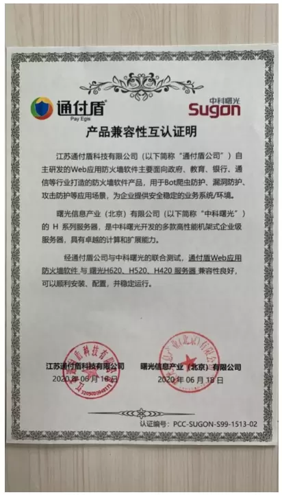 互认!通付盾Web爬虫防火墙与中科曙光服务器成功完成国产化适配