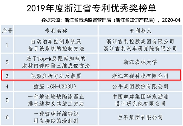 近日,浙江省市场监管局发布2019年度浙江省专利项目绩效评价(省专利奖)获奖榜单,榜单由各市市场监督局、国家知识产权示范园区、国家知识产权局、高校、科研院所、两院院士等推荐申报、自荐,经过多层审查、评议及现场答辩等程序,对申报专利从技术先进性、经济效益、管理保护水平等方面量化评价。其中,宇视科技(uniview)发明专利《视频分析方法及装置》获浙江省专利优秀奖,成为业内唯一上榜安防厂商。