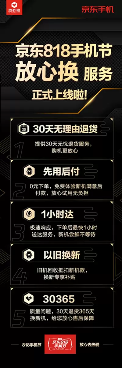 “放心换”服务共包含5项类别,通俗来讲就是在京东818手机节期间购购买手机的用户,可享受30天无理由退货、先用后付、1小时送达、以旧换新、30365等贴心服务!肖女士表示,京东手机这个“放心换”服务“意图”太明显,怎么贴心怎么来!