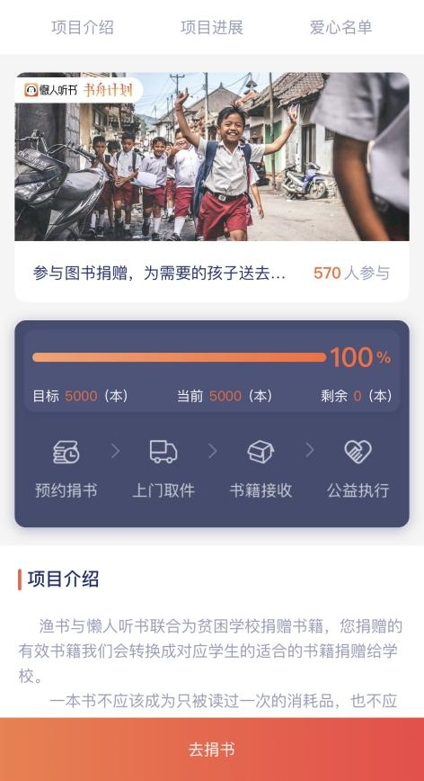 据了解,懒人听书“书舟计划”捐书渠道也将长期在懒人听书APP上线,为全民参与图书循环和共享,关注少数群体阅读权益、分享快乐和知识提供便利。