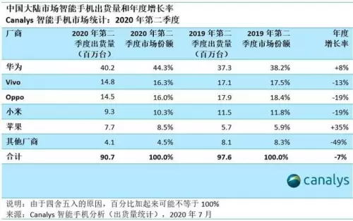 根据Canalys的数据显示,华为在2020年Q2季度首次超越三星,成为全球出货量第一的智能手机厂商;vivo 排第二,市场份额达 16.3%,环比增长 23%;OPPO 和小米分别排在第三和第四位,出货量分别为 1450 万和 930 万台;受在线销售增长和低价产品组合的推动,苹果 iPhone 今年第二季度在中国的出货量为 770 万部,排名第五。