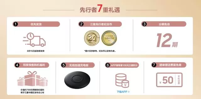 8月5日晚,三星电子以线上发布会的形式正式向全球发布了旗下新一代高端5G旗舰智能手机Galaxy Note20系列。与此同时,三星网上商城也同步开启了三星Galaxy Note20系列新品“先行者计划”活动,成功订购的消费者将享受先行者7重礼遇:1、8月15日优先发货的专属权益;2、获赠三星先行者纪念币一枚;3、购机享12期免息分期;4、同享价值约799元预售购机福利;5、赠三星原装无线加速充电板;6、下载三星商城APP端预订加赠100元三星积分;7、晒单赠50元手机话费,还有机会赢免单。超值购机福利,一次性给足你,更能先人一步“尝鲜”三星Galaxy Note20系列旗舰带来的前沿创新和真香体验。