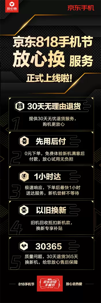 为保障消费者在818手机节期间的消费权益,京东专门推出“放心换”专属服务,全面升级30天无理由退货、先用后付、1小时达、以旧换新、30365等5个贴心服务,让你购机无忧,体验无忧,购买决策更从容!