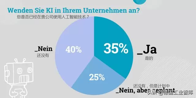 此外,四分之一的受访者虽然还未使用AI,但已经在计划当中。40%的企业表示暂时没有相关的计划。主要的原因在于缺乏对于人工智能在企业中投入使用的全局视野,不确定的经济效益以及缺乏专业的知识和人才。