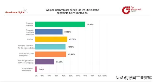 的企业都是中小企业,对于他们来说,人工智能技术的获取与评估正面临极大的挑战,不是每个中小企业都拥有该领域的高素质人才。许多大企业都拥有强大的人工智能解决方案和丰富的经验,德国政府正透过扮演大企业与中小企业之间的桥梁,以及相关人工智能政策、各种创新挑战赛等,对中小企业伸出援手,让他们更加理解