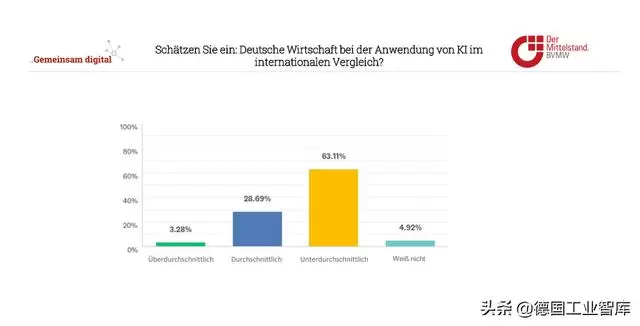 因此,作为一个在德国生活的普通人,很难在每天的生活中直接享受这些技术成果。对于各方面实力相对比较薄弱的中小企业亦如此。如上图所示,有63.11%的受访者认为德国在人工智能方面的应用落后于国际平均水平。只有3.28%的企业认为德国在人工智能领域超越国际平均水平。