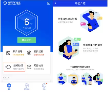 腾讯手机管家智能接听助理功能可在用户漏接电话、不方便接听、遇到陌生电话不想接听时进行智能代接,询问来电目的,并将通话内容转换为文字保存,提醒用户及时查看未接电话内容。