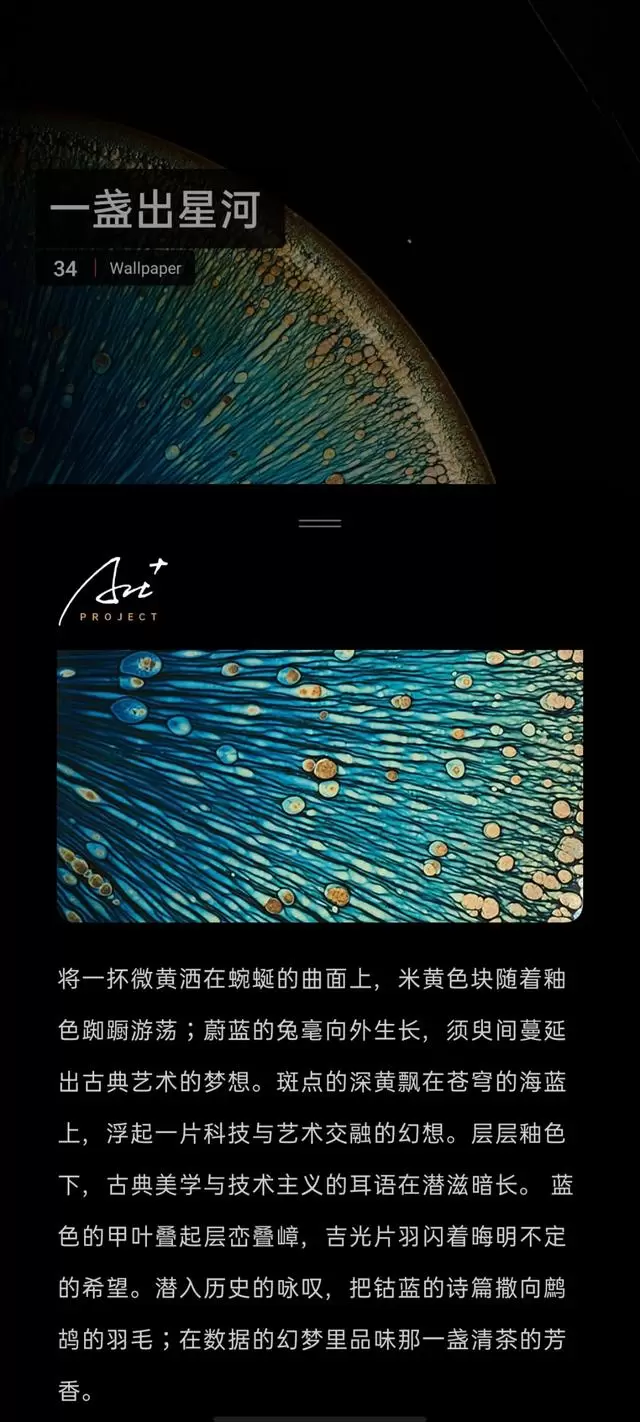 高级的审美,离不开艺术的加持。在ColorOS 7中,官方新增入了Art+艺术壁纸,汇聚全球顶尖艺术家联合打造,美学底蕴十分了得。而除了壁纸素质较高外,其具有艺术涵养也非同小可,就拿"一色入而万彩出"这专题为例,这期专题以中华文化中"窑变釉"的经典色彩为蓝本,请来国家级建盏大师孙建兴指导,真实还原了窑变釉色彩之美。