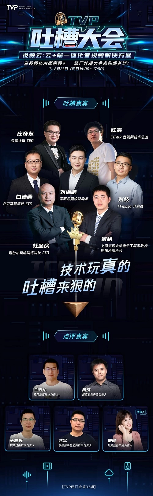 参会规则:TVP吐槽大会第3期”采用线上会议形式,限量100名观众席名额免费开放。在云加社区网站搜索「TVP吐槽大会」可查看更多内容并获取参会报名二维码,通过审核后即可成为会议特邀嘉宾入场围观音视频技术巅峰对决,看看他们能否击中你的内心。
