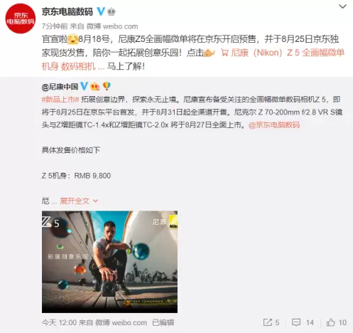 对于摄影党来说,每次看到新摄影设备都是心动的感觉。这不,最近尼康中国在微博上官宣了自家Z5全画幅微单新品火热来袭,目前京东已经上线预约页面,同时8月11日开启独家预售,并将于8月25日在京东独家现货首发,再次掀起尼康粉的嗨点,并同步推出了全画幅格式尼克尔Z卡口24-50mm f/4-6.3轻巧镜头等多款新品,全新的硬核设备引发不少摄影衷粉热议,在微博上直呼:千元级别的全画幅微单终于来了,买它!