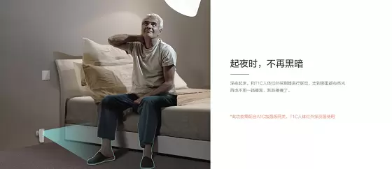 对于不少老人都有的起夜习惯,也可以通过萤石智能开关和T1C人体红外探测器进行联动,自动感应老人起夜,联动灯光打开,防止黑暗中老人出现磕碰、摔跤等危险意外。