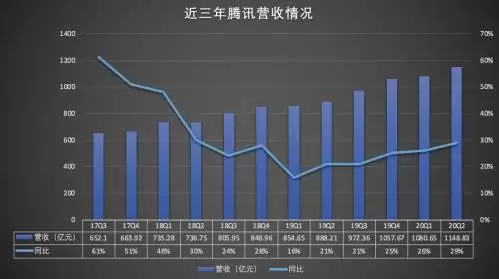 8月12日,腾讯发布2020年二季度财报,营收1148.83亿元,同比增长29%,这是腾讯自2019年一季度以来,营收增幅最高的一个财季,主要依赖网络游戏的增值服务营收占比从上季度的57.8%降至本季度的56.6%。包含云计算的金融科技及企业服务业务营收仍是增幅最大的板块,且占比从上季度的24.5%提高到26%。从这一变动可以看出腾讯对数字经济、新基建等战略方向的笃定,但新老业务占比的此消彼长不算明显,也表明了腾讯“大象转身”的不易。