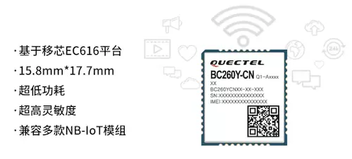 其中,移远NB-IoT模组BC260Y基于移芯EC616平台研制而成,尺寸仅为15.8*17.7mm,可兼容移远BC28、BC26和BC25等NB-IoT模组。该模组凭借超低功耗、超高灵敏度、主流尺寸等优势,得到业内广泛关注,将在2020年8月份实现量产。
