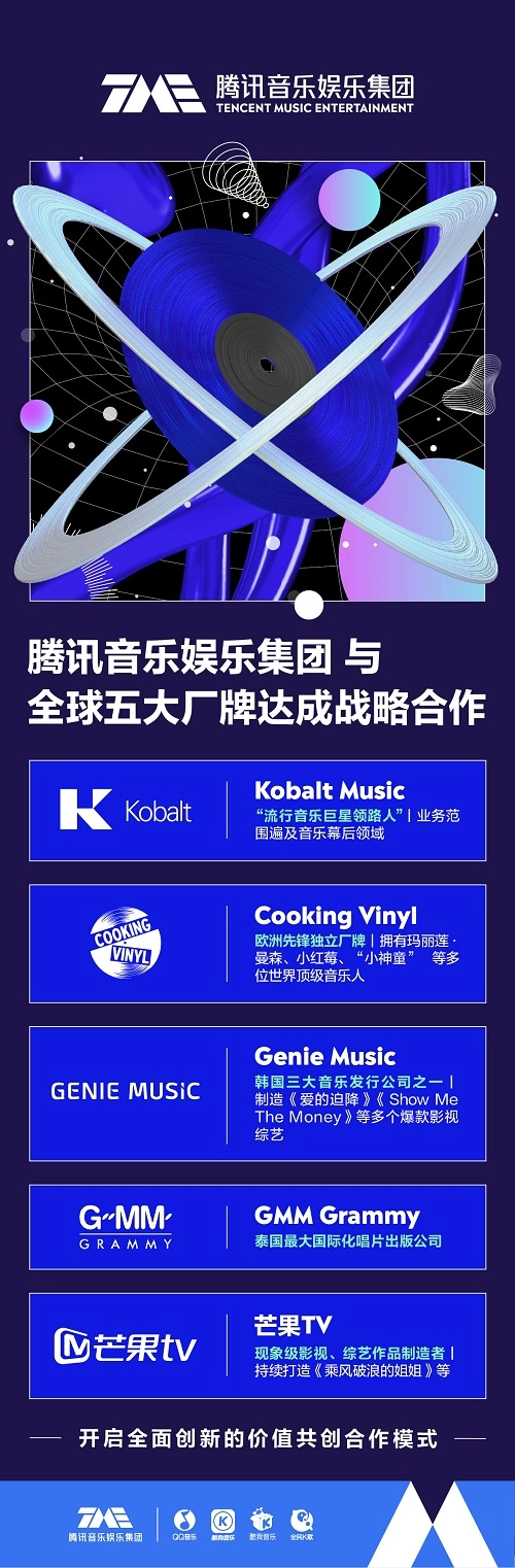 此次与腾讯音乐娱乐集团达成战略合作的厂牌覆盖欧美、日韩、东南亚等多国。内容多元,从大众流行到独立先锋,从影视音乐到综艺音乐,从经典金曲到新锐新声:包括业务范围遍及音乐幕后领域的“流行音乐巨星领路人”Kobalt Music、拥有玛丽莲·曼森、小红莓、“小神童” 等多位世界顶级音乐人的欧洲先锋独立厂牌Cooking Vinyl、制造《爱的迫降》、《ShowMeTheMoney》等多个爆款影视综艺的韩国最大音乐发行公司之一Genie Music,以及泰国最大国际化唱片出版公司GMMGramy和持续打造《乘风破浪的姐姐》等现象级影视、综艺作品的芒果TV。腾讯音乐娱乐集团通过与多家头部厂牌的强强合作,为用户带去更为丰富多元的音乐内容。