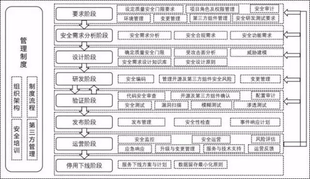 而七大环节则分为软件应用服务研发的要求阶段、安全需求分析阶段到上线后的发布阶段、运营阶段、停用下线阶段等七个阶段。